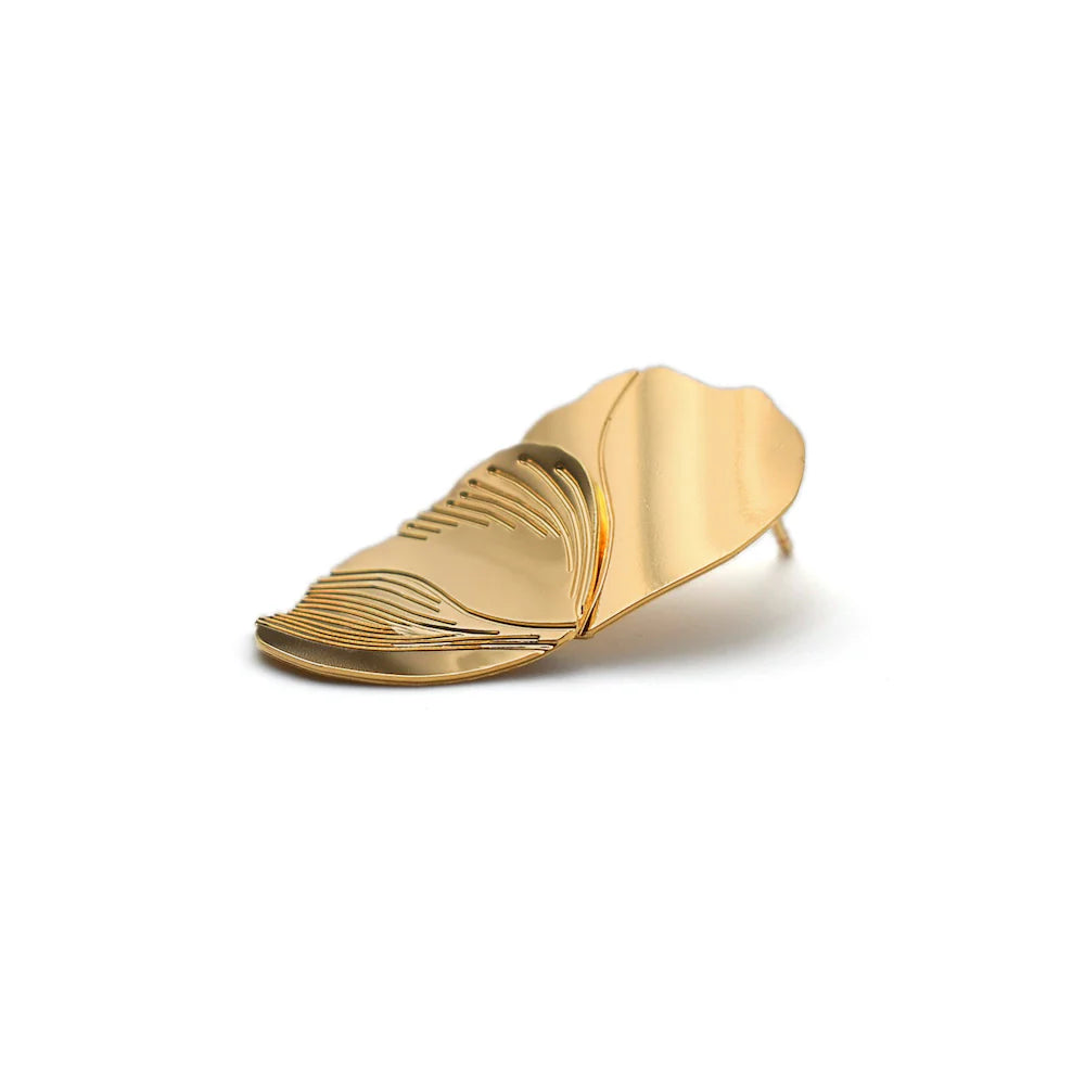 Les boucles d’oreilles Mouvement de chez Nadja Carlotti sont de véritables sculptures miniatures. Composées de deux pétales superposés en laiton doré à l’or fin, elles semblent bouger délicatement, comme des fleurs animées par une légère brise. Leur design poétique s’inspire des clochettes vertes de l’Euphorbe, un arbuste charentais dont les formes naturelles ont inspiré la créatrice.