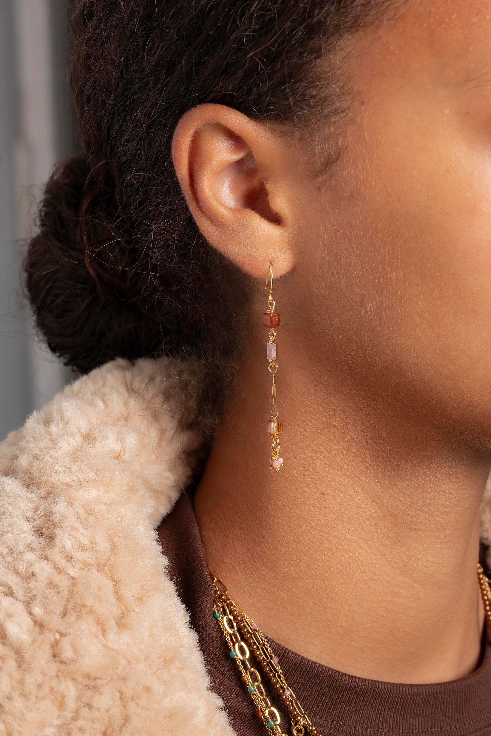 Ces boucles d’oreilles asymétriques signées Murielle Perrotti mêlent subtilement des pierres fines aux teintes chaudes et naturelles : grenat hessonite, quartz rose, serpentine verte, rhodolite, péridot et cristal.