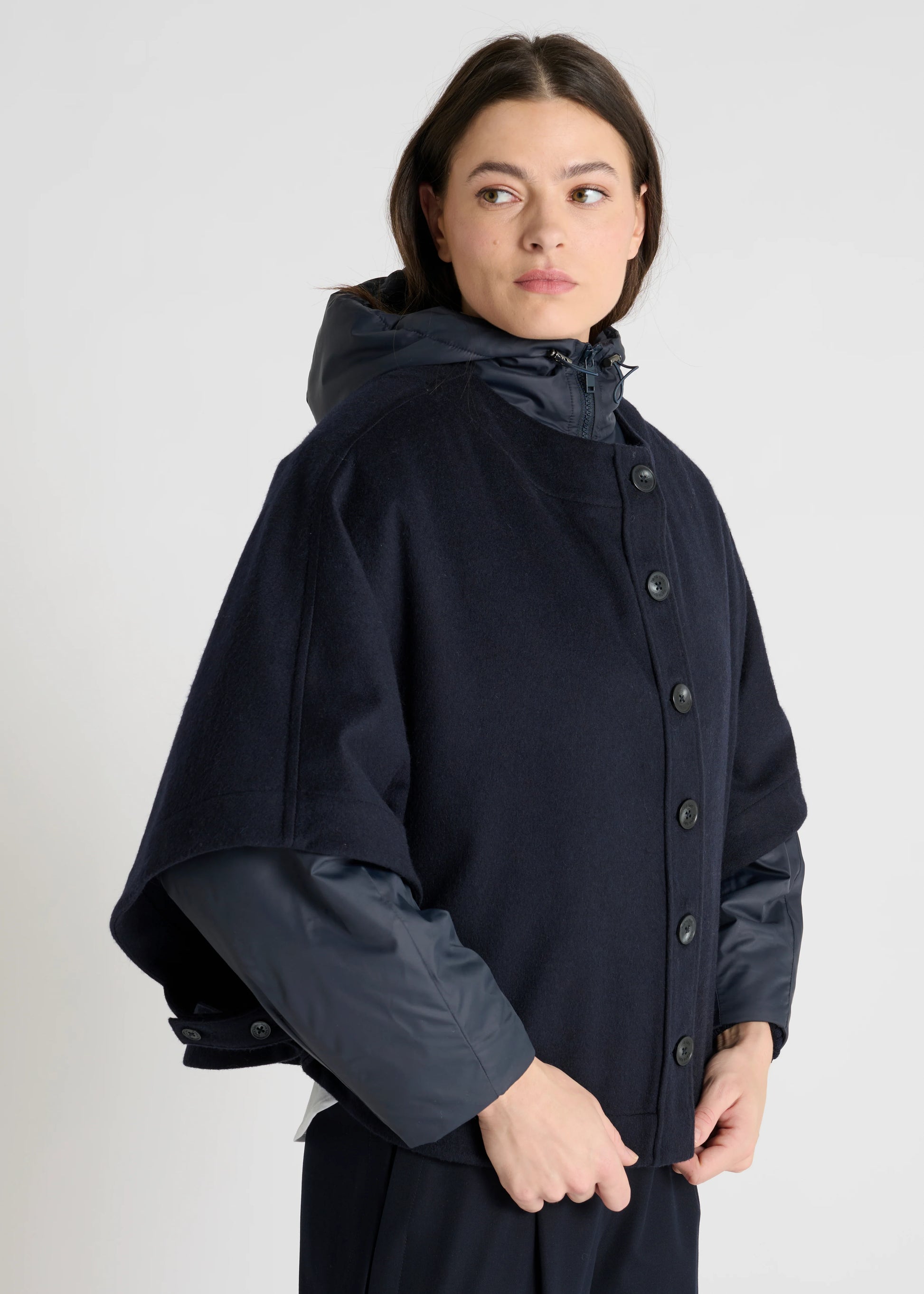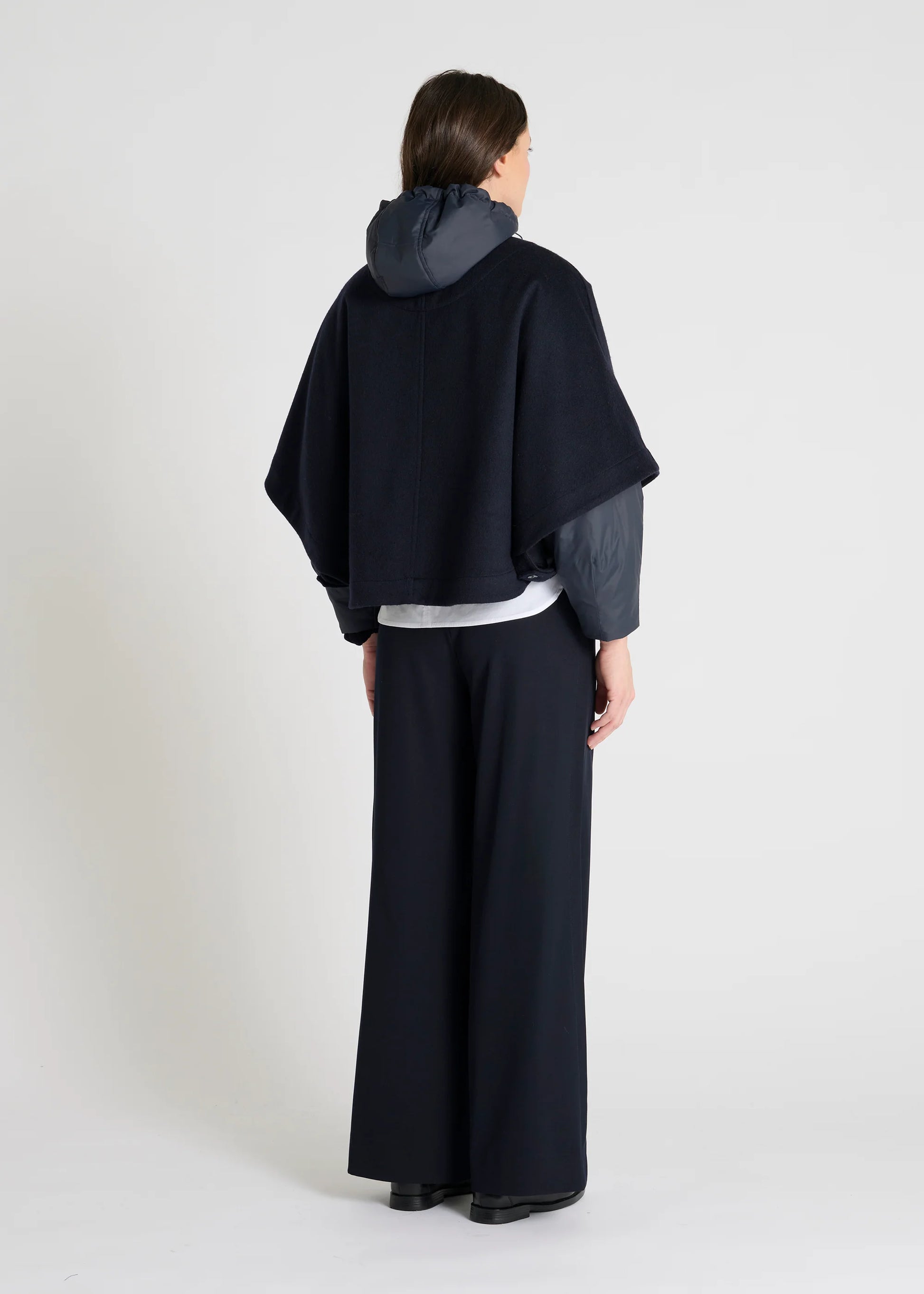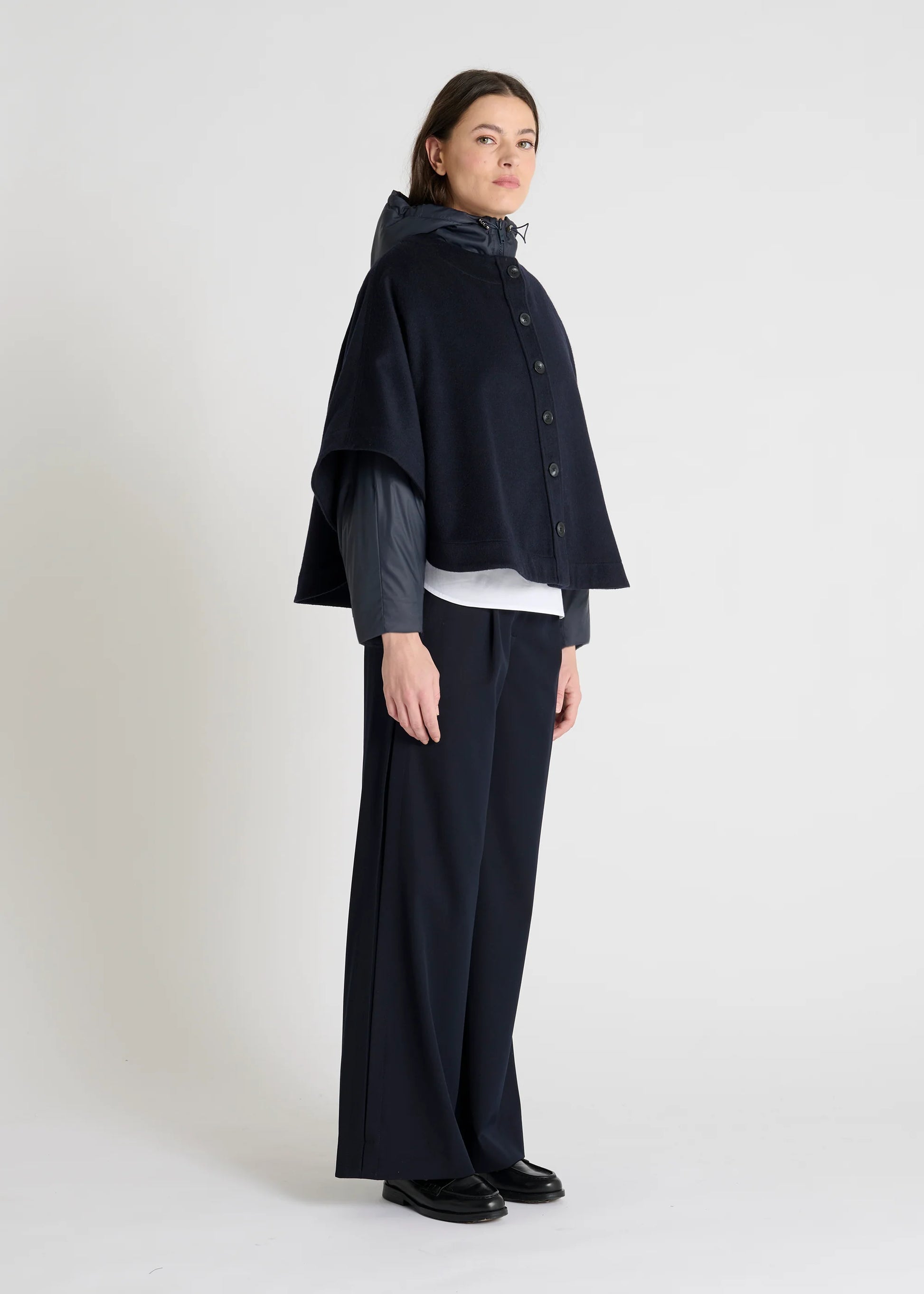 Des pattes boutonnées relient le devant et le dos pour maintenir la cape en place tout en préservant une liberté de mouvement fluide. Son boutonnage intégral sur le devant et sa couture milieu dos accentuent la pureté de sa ligne.