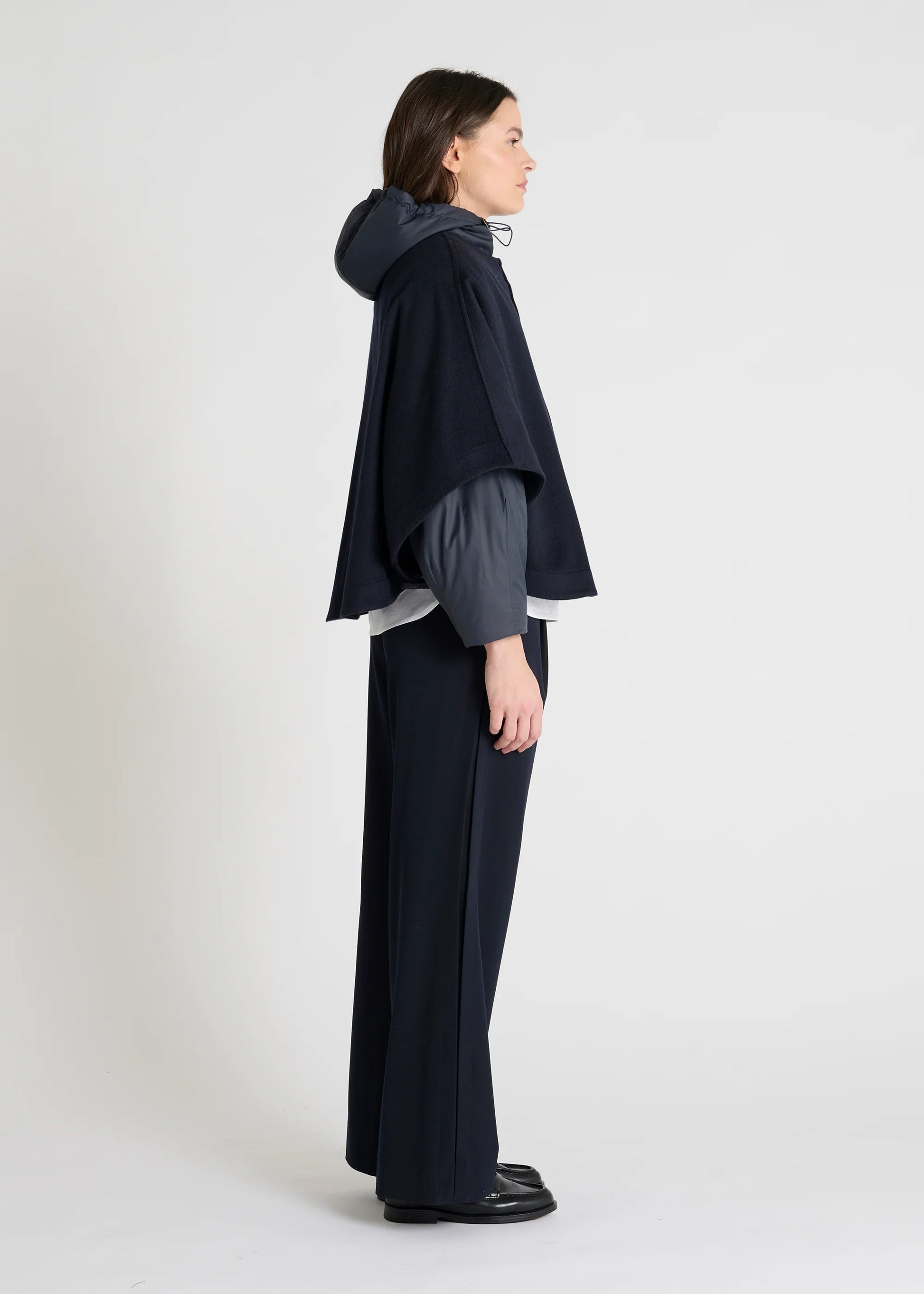 La cape Nina de Hana San se distingue par sa ligne courte et son volume arrondi, enveloppant la silhouette avec légèreté. Confectionnée en laine, elle offre chaleur, souplesse et une allure naturellement structurée.