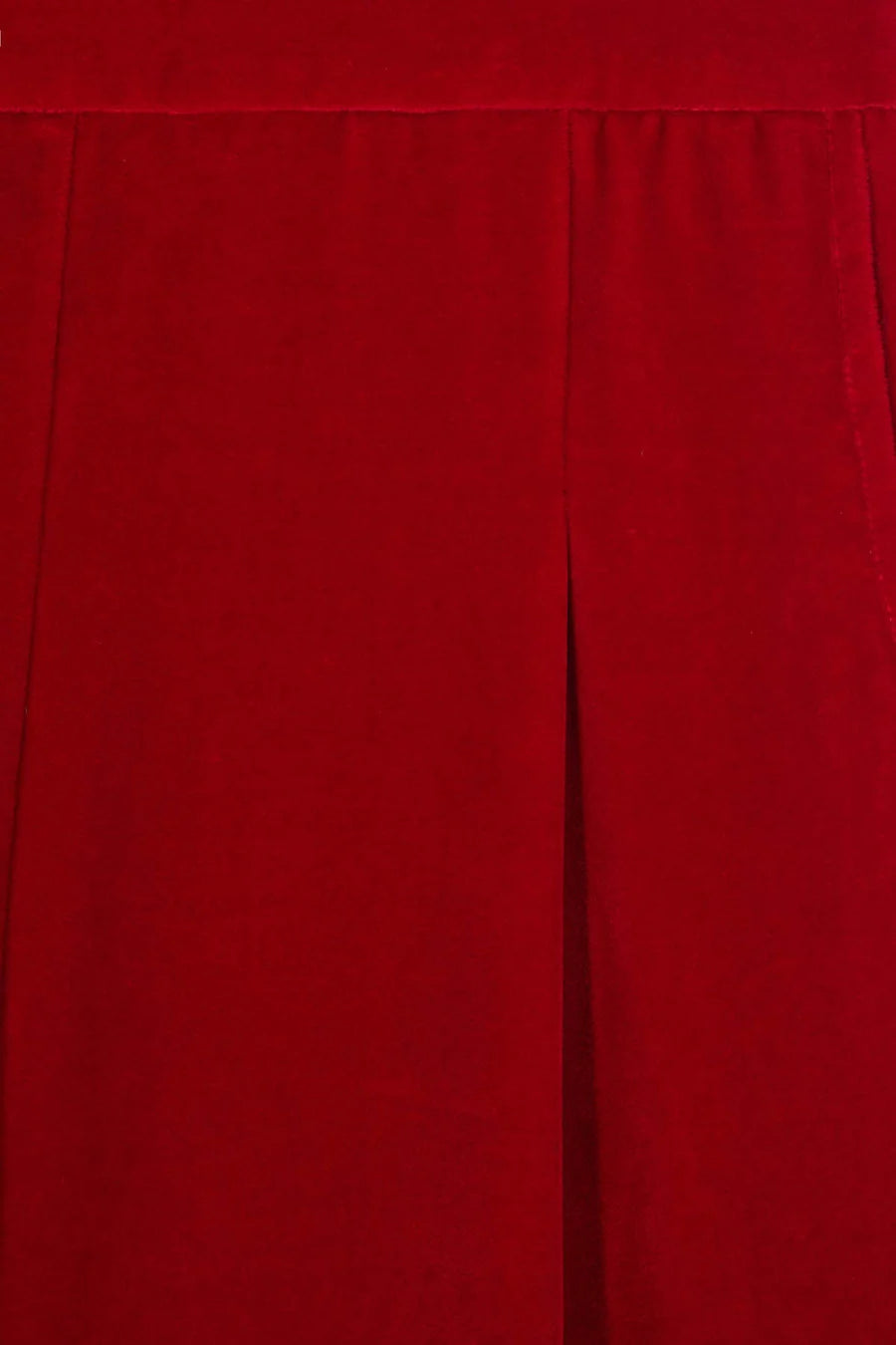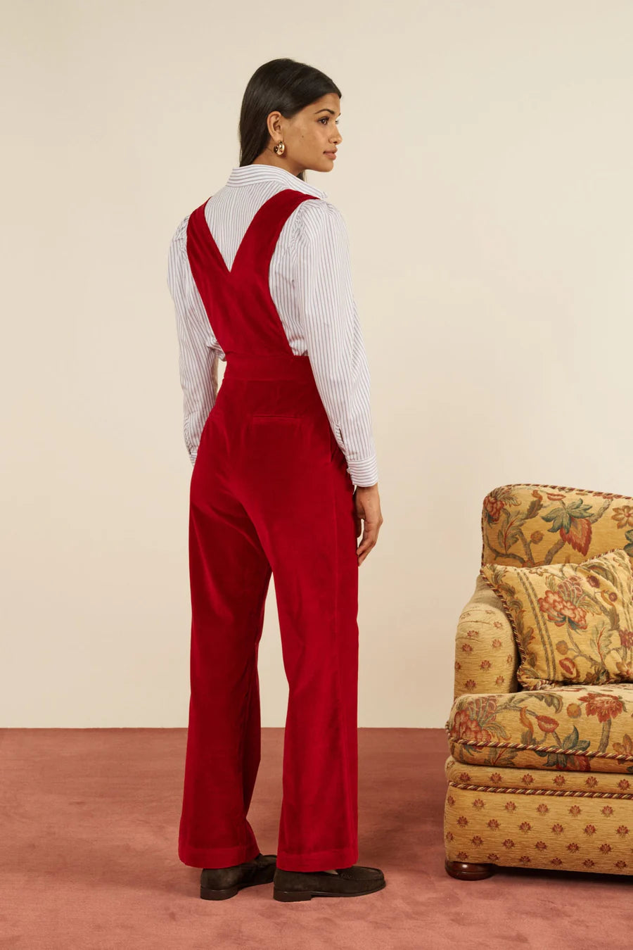 La combinaison Pola de Maria de la Orden sublime la silhouette avec son velours rouge profond et son décolleté en V audacieux à l’avant comme à l’arrière. Sa taille marquée et son pantalon droit structurent la coupe, tandis que les plis délicats aux cuisses apportent du mouvement et de l’élégance.
