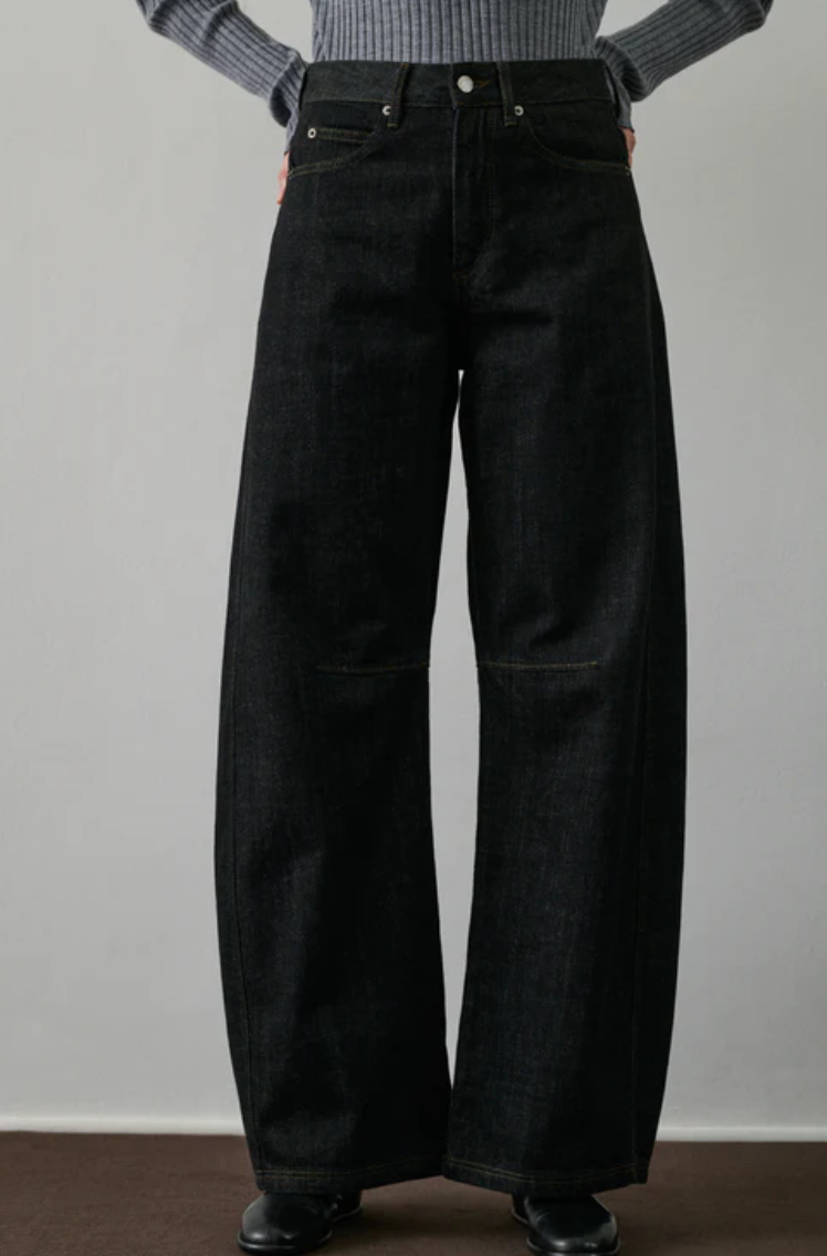 Fabriqué en coton régénératif, il reflète l’engagement de la marque en faveur d’une mode plus responsable. Les pinces aux genoux, le patch en cuir, ainsi que les finitions brutes en denim noir en font une pièce structurée et intemporelle.