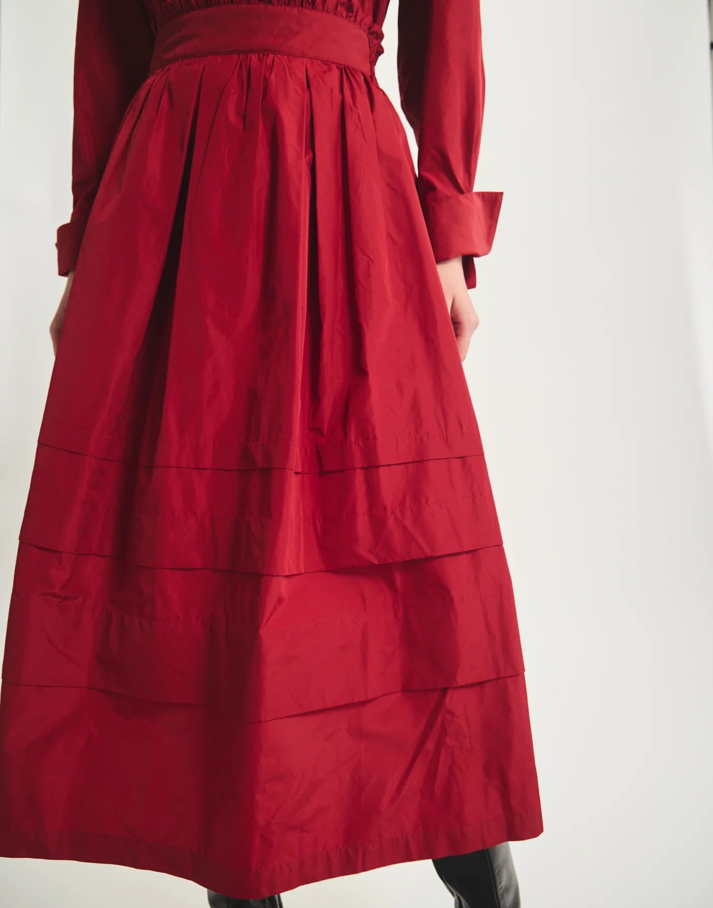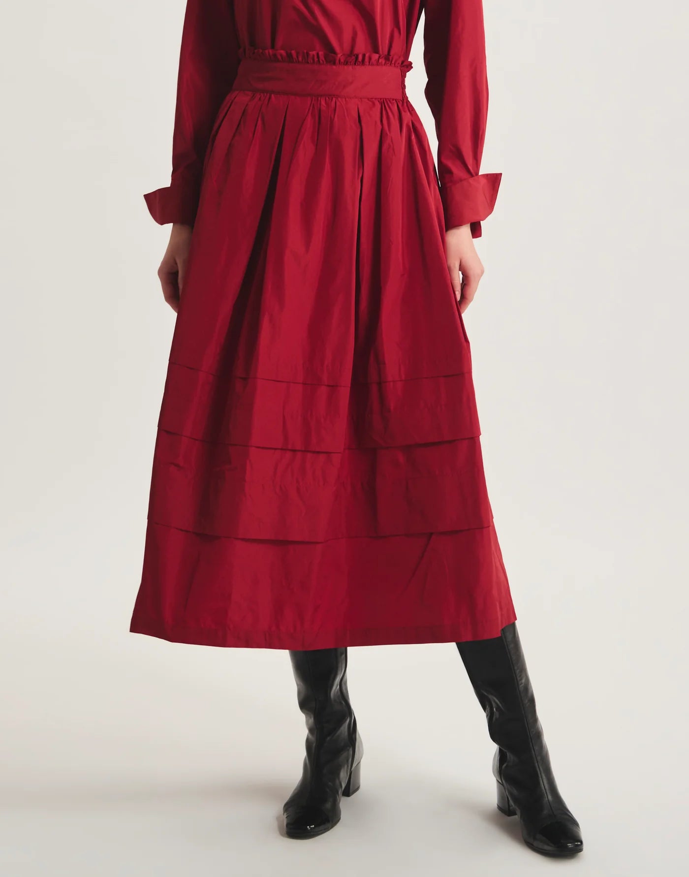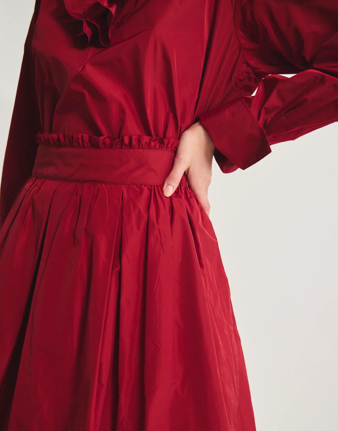 Alliant simplicité et raffinement, la jupe Héloïse en taffetas rouge incarne toute l’élégance de la maison Inès de la Fressange. Sa coupe évasée ornée de volants crée un mouvement gracieux à chaque pas, tandis que la taille élastiquée et les plis délicats soulignent une silhouette fluide et féminine.