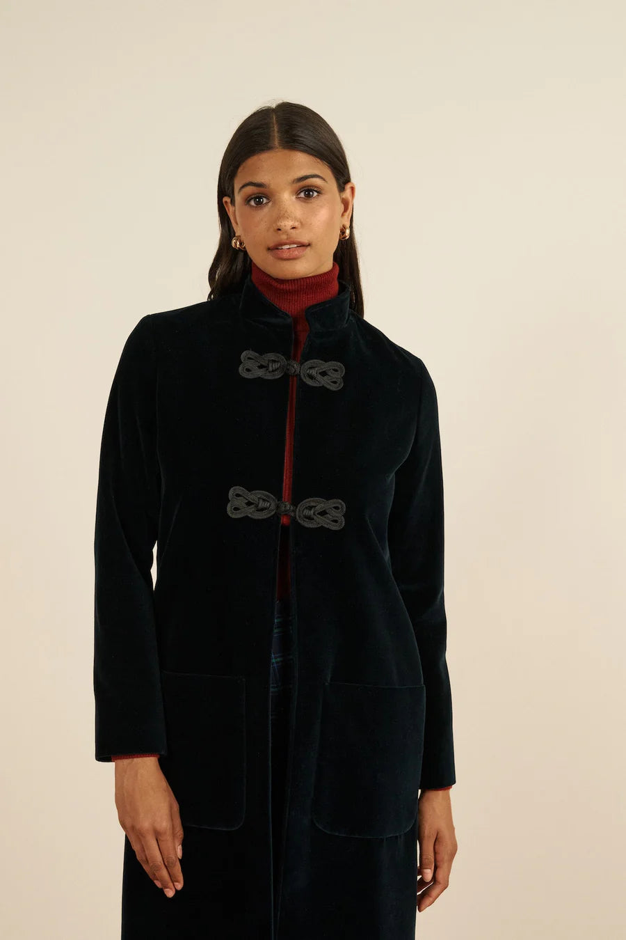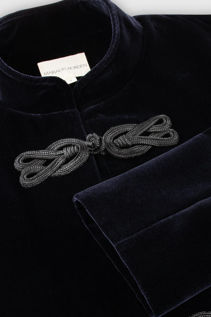 Son col mao épuré et ses deux boutons brandebourgs en font une pièce raffinée, idéale pour habiller vos tenues de fête ou vos looks du quotidien. Confectionné en velours marine 100% coton et fabriqué en Serbie, ce manteau allie savoir-faire et qualité des matières pour traverser les saisons avec allure.