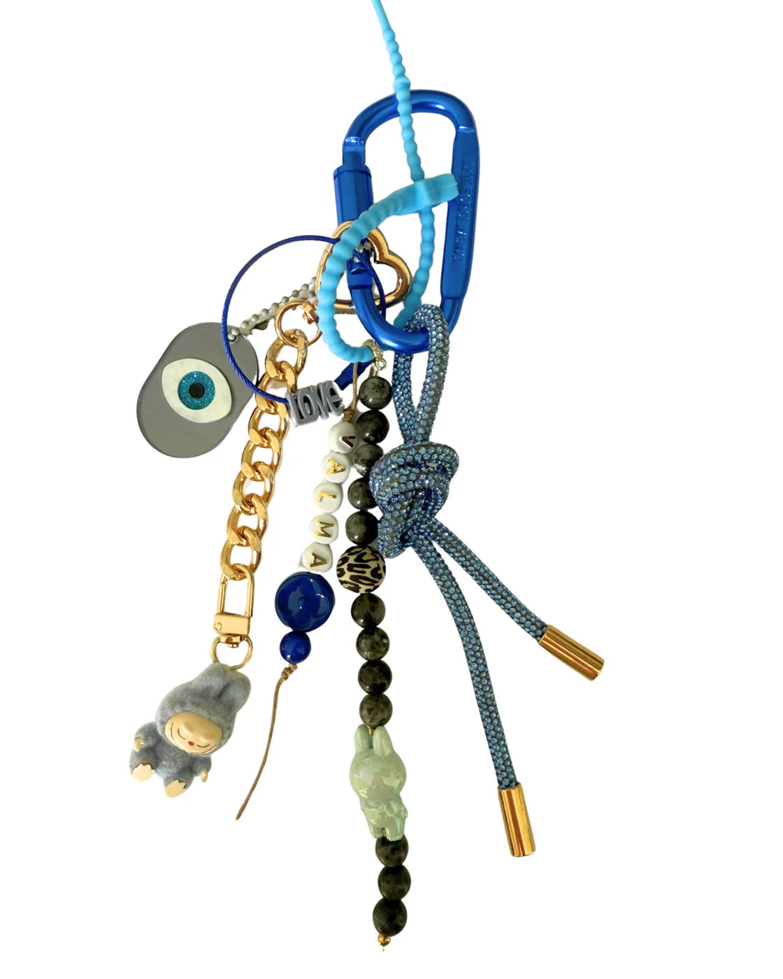 Le porte-clés Blue Shield de Valma est un bijou de sac protecteur orné de perles de labradorite aux reflets bleutés et irisés.