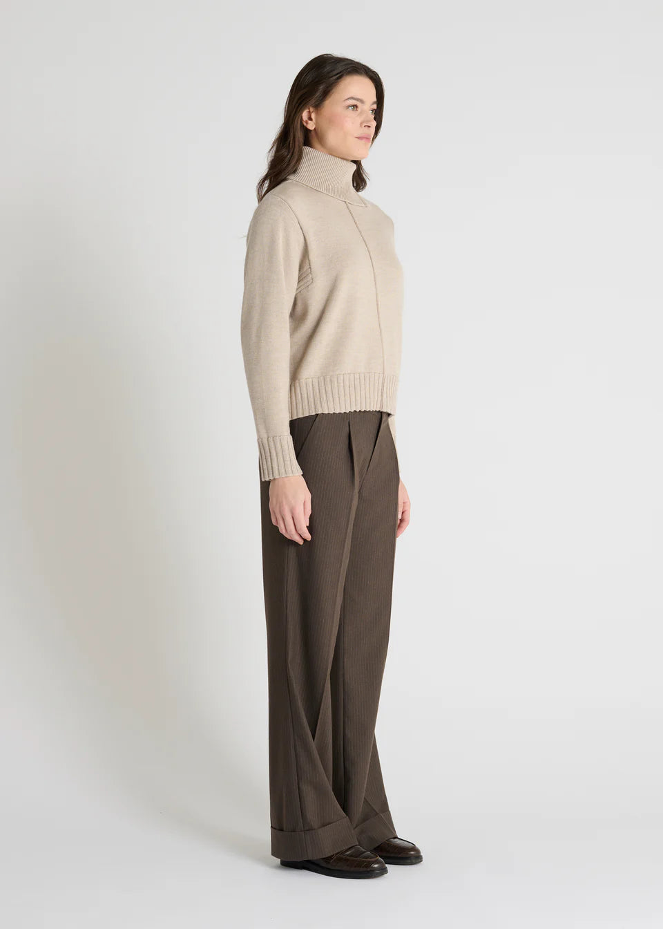 Le col roulé fendu sur le côté gauche apporte une touche d’originalité tout en restant discret et élégant. Les manches longues ornées d’un jeu de côtes ajoutent de la texture et de la modernité, tout en gardant un tombé fluide. Sa couleur ficelle, douce et naturelle, en fait une pièce facile à associer pour un style chic et cosy.