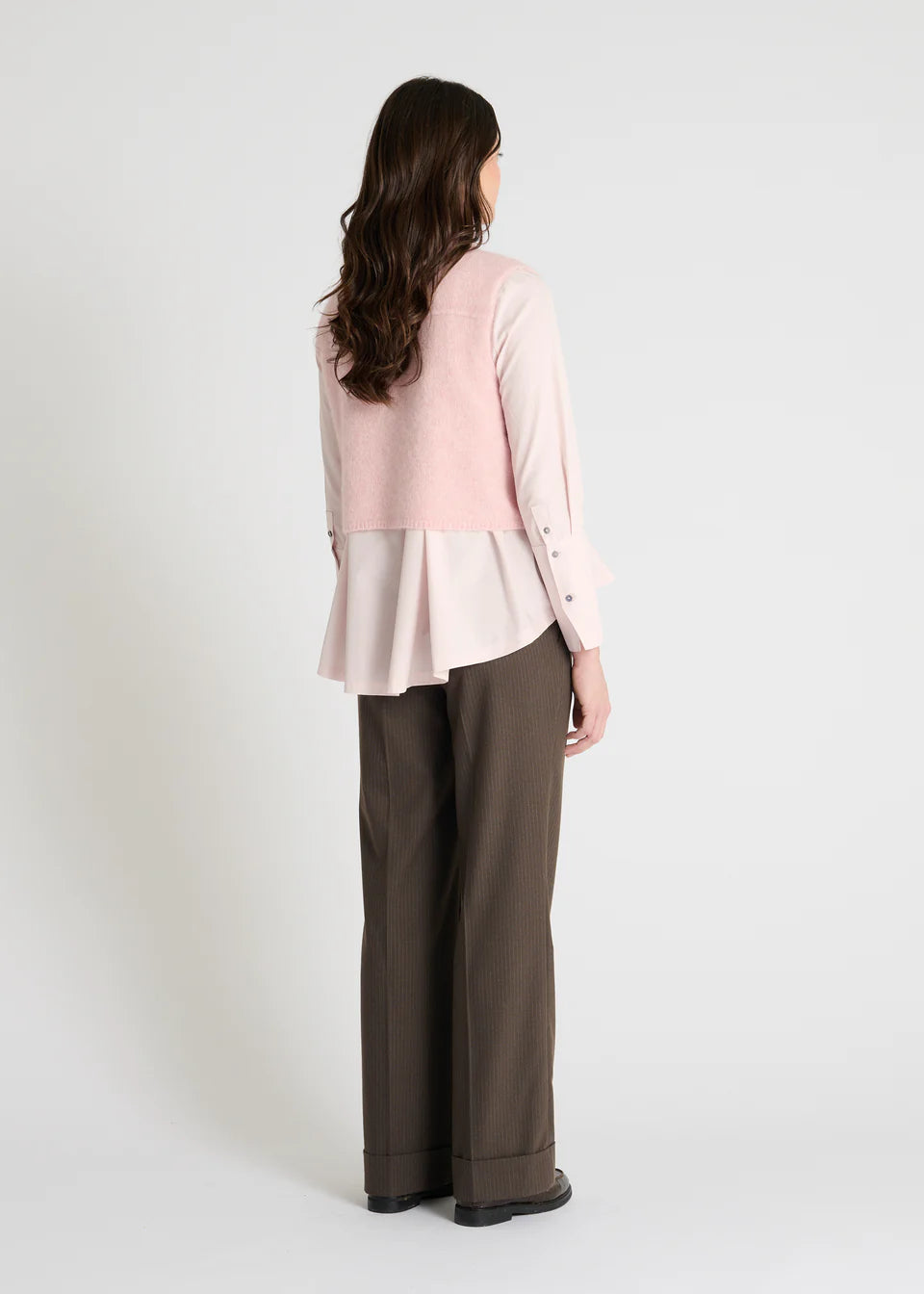 Son col roulé en bord-côte met en valeur le port de tête avec élégance, tandis que les coutures nervures apparentes au milieu devant et dos apportent une touche subtile de caractère. Avec sa coupe débardeur, il est parfait porté seul pour un look minimaliste ou en superposition sur une chemise ou une blouse pour une allure plus travaillée.