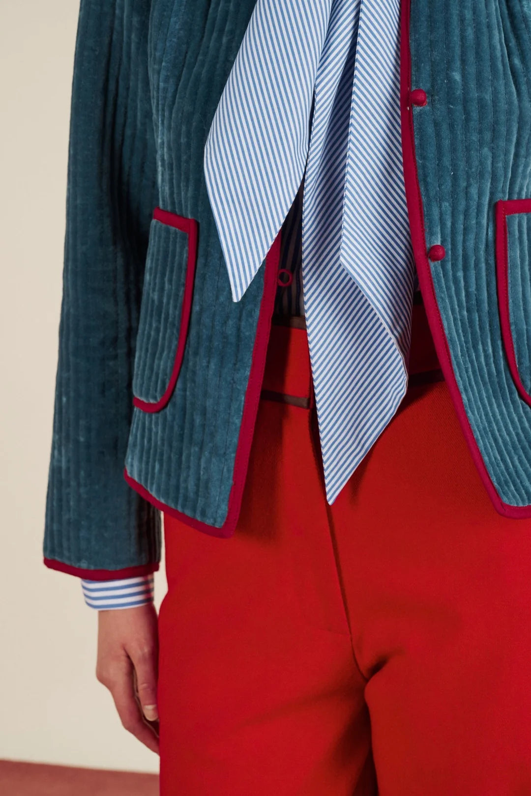 La veste Fittonia de Maria de la Orden séduit par son esprit rétro et raffiné. Confectionnée en coton velours, elle se distingue grâce à son passepoil coloré et ses boutons contrastés, qui apportent une note ludique et originale.