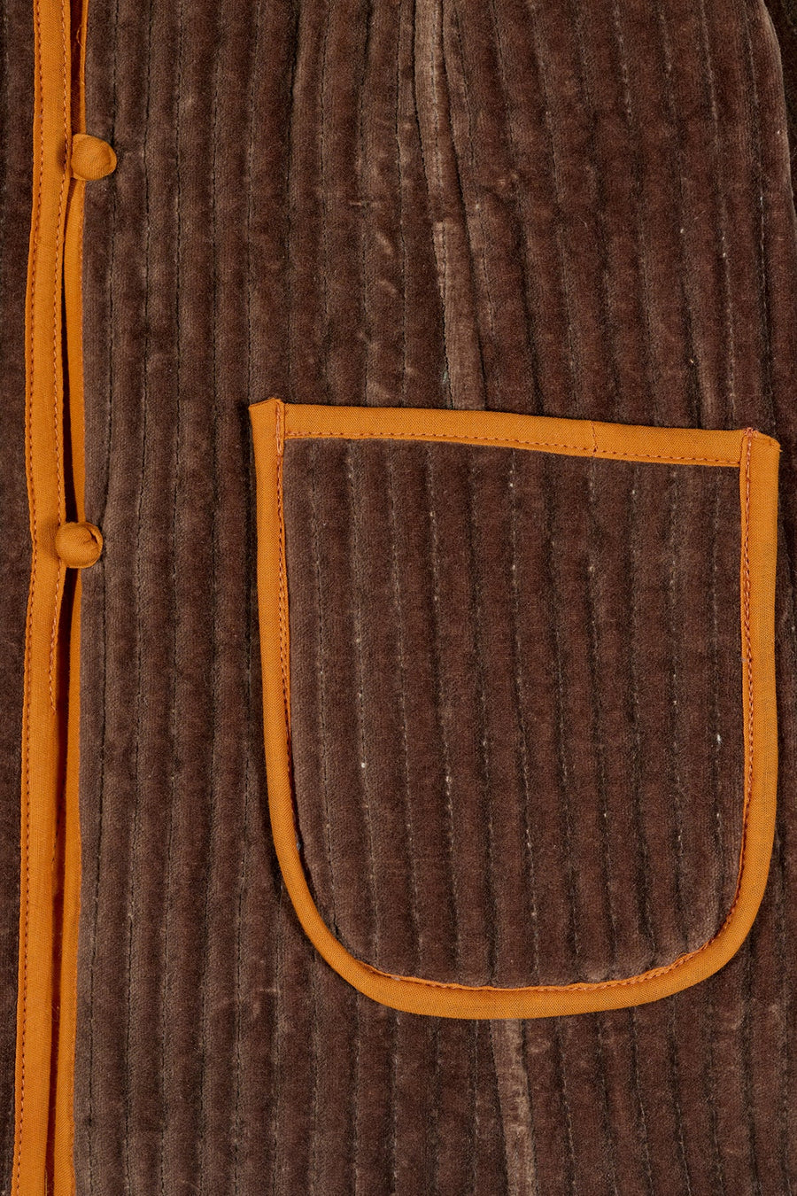 La veste Fittonia Marron de Maria de la Orden séduit par son esprit rétro et raffiné. Confectionnée en coton velours marron, elle se distingue grâce à son passepoil orange vif et ses boutons contrastés, qui apportent une note ludique et originale.