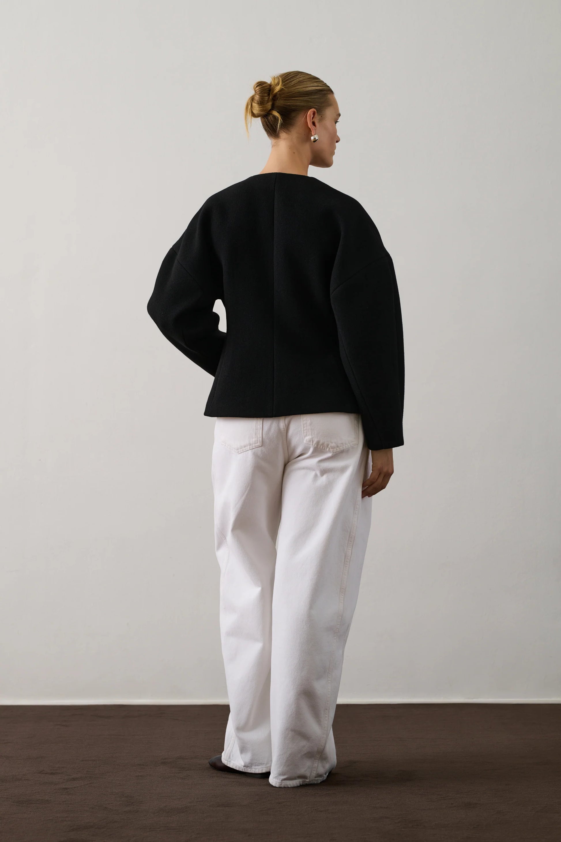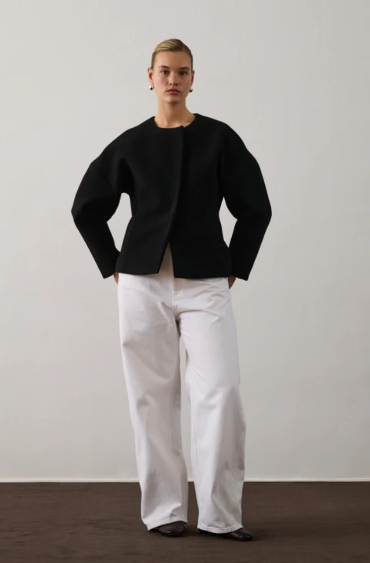 La Veste France Noir de Soeur incarne le chic sobre et raffiné. Conçue en drap de laine bouillie, elle offre une silhouette cintrée à la taille et une longueur aux hanches, idéale pour structurer une allure élégante.